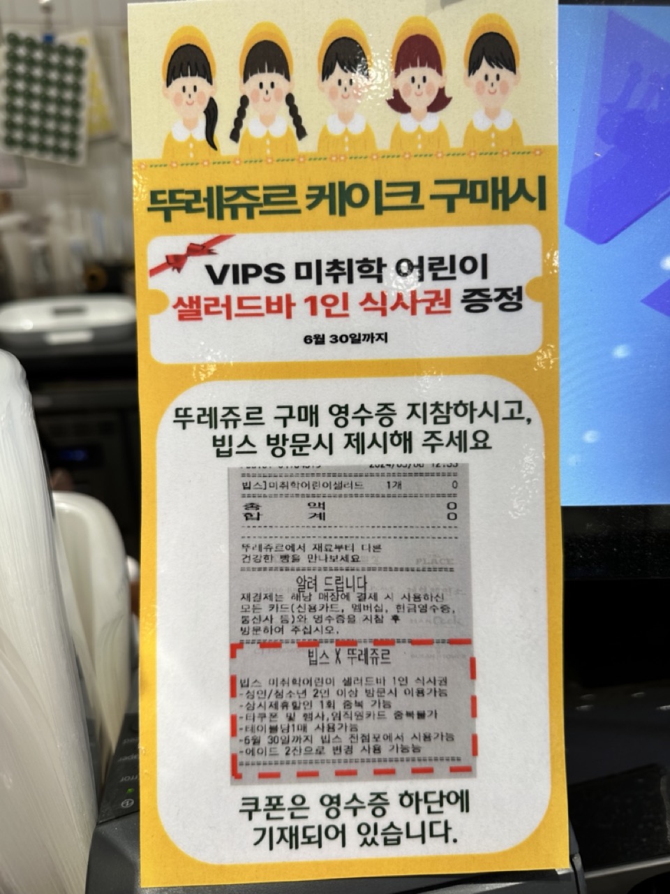 VIPS에서 미취학 어린이 샐러드바 1인 식사권을 증정하고 있습니다.