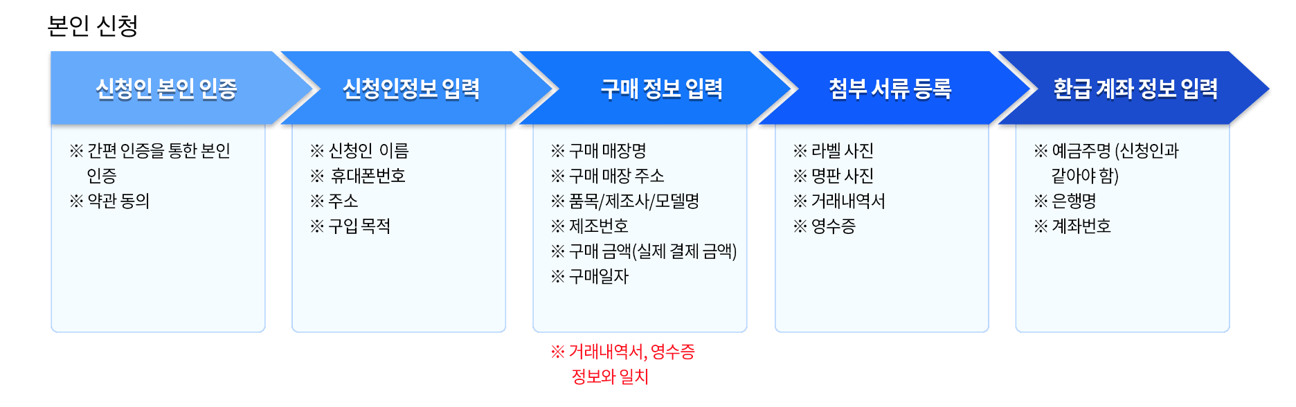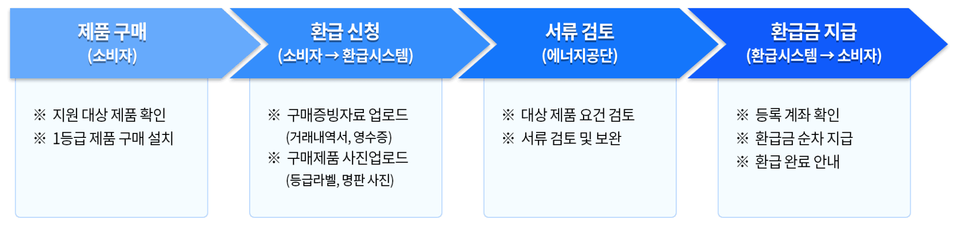 신청은 총 네단계로 진행됩니다. 1단계는 사이트 회원가입과 본인 인증, 2단계는 제품 구매일과 품목 등록, 3단계는 서류 제출, 4단계는 처리 결과 확인입니다. 로그인 후 '환급신청'메뉴를 클릭하면 자동으로 구매일자와 신청가능금액이 화면에 표시되어 누구나 쉽게 진행할 수 있습니다.